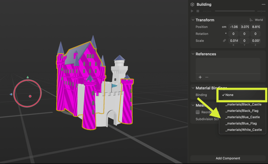 亮粉紅色在此類遊戲引擎中,通常代表的是「材質遺失」,在上圖案例中就是 Reality Composer Pro 找不到材質的意思。