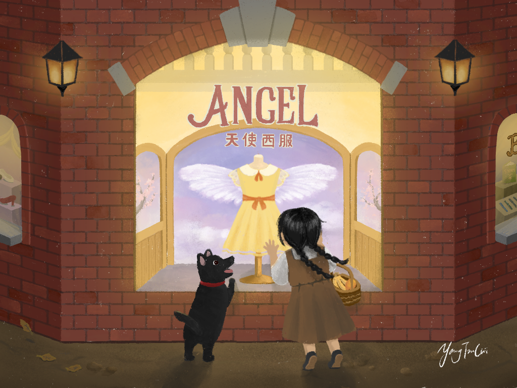 Overjoyed, MeiMei twirls in front of the building; she stands directly beneath the shop’s “Angel" sign,becoming the “Angel of the Red House.”