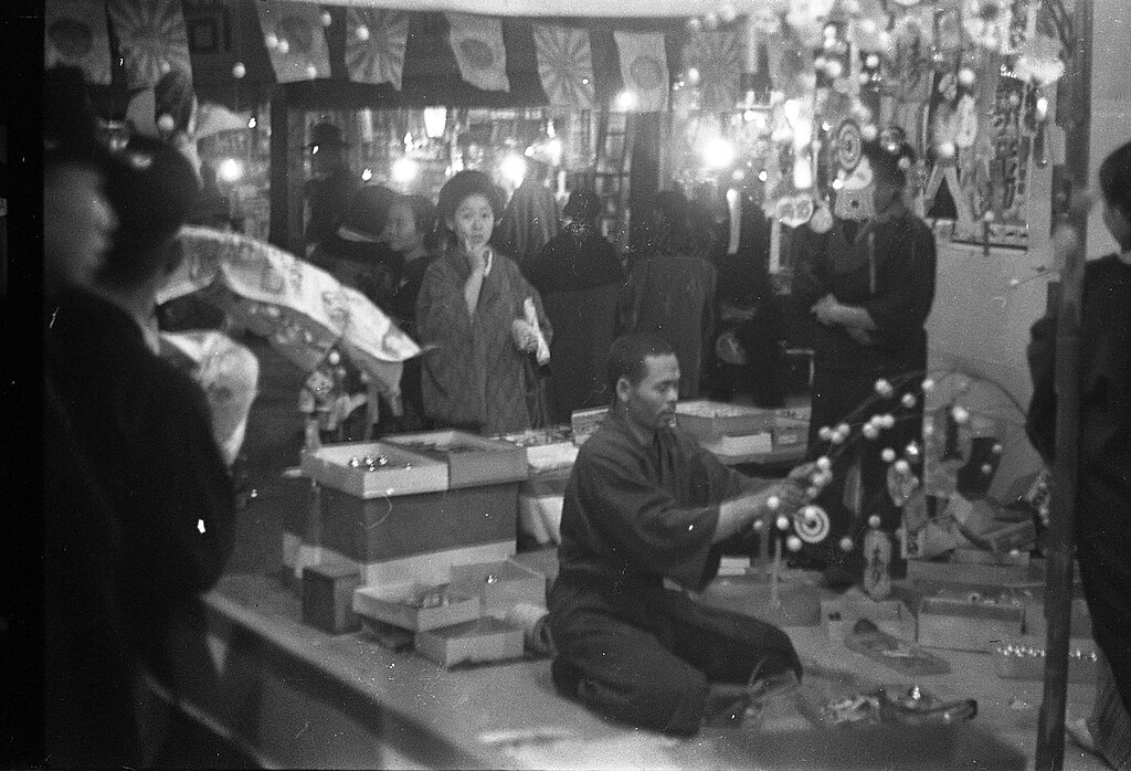 The rickshaws pass through the grand doors into the bustling interior of the Red House. The atmosphere is vibrant and organized, filled with stalls selling delicate Japanese stationery, Western-style clothing, and local specialty goods.