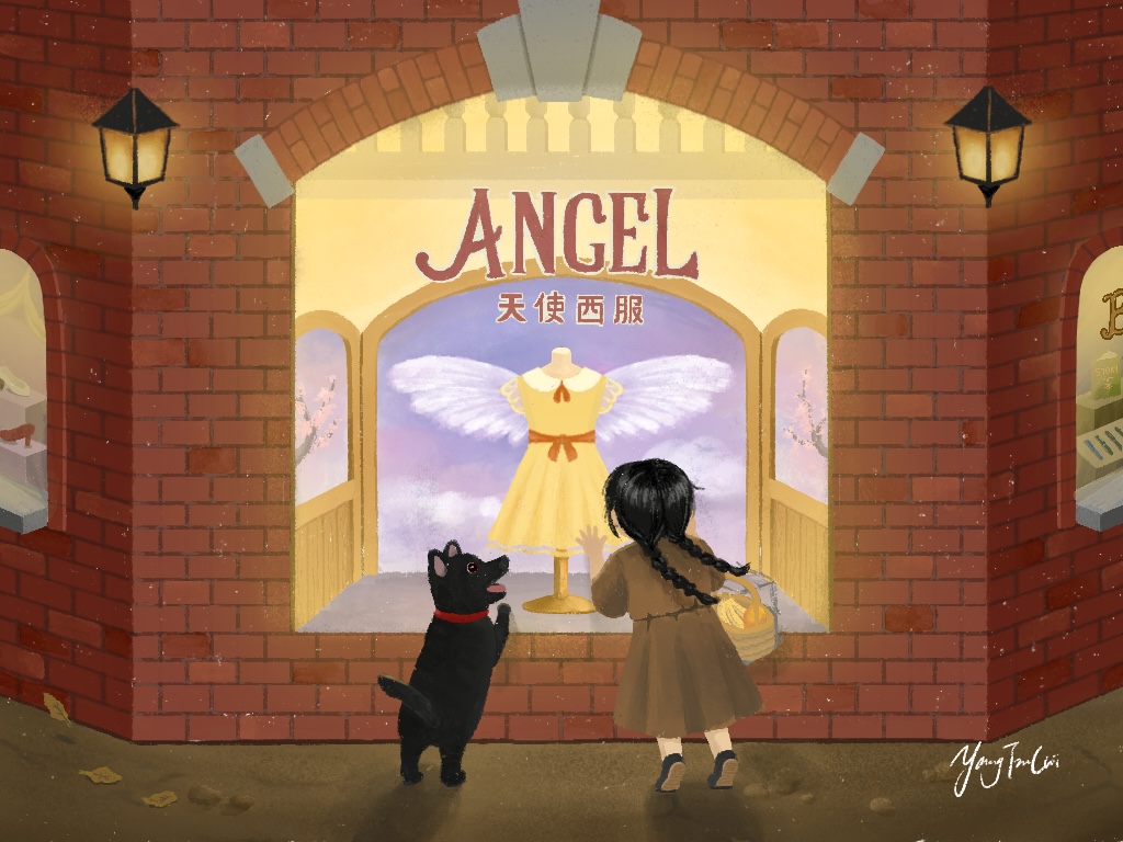 Overjoyed, MeiMei twirls in front of the building; she stands directly beneath the shop’s “Angel" sign,becoming the “Angel of the Red House.”