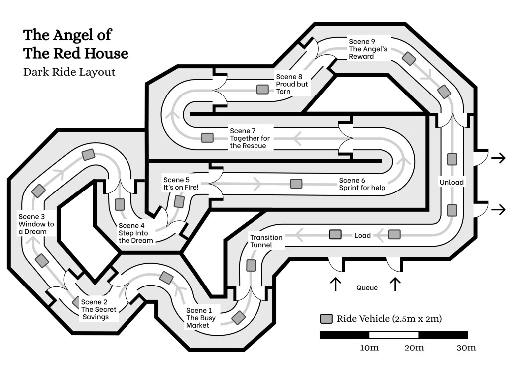 Drawing from the oral histories of families who worked in these markets, I sought to recreate this vibrant world. My goal was to present more than just history; I wanted to showcase the Taiwanese spirit, a blend of personal bravery and deep community warmth. Through MeiMei’s journey, this ride celebrates a community that protects its own, honoring the people who made the Red House a legendary landmark.